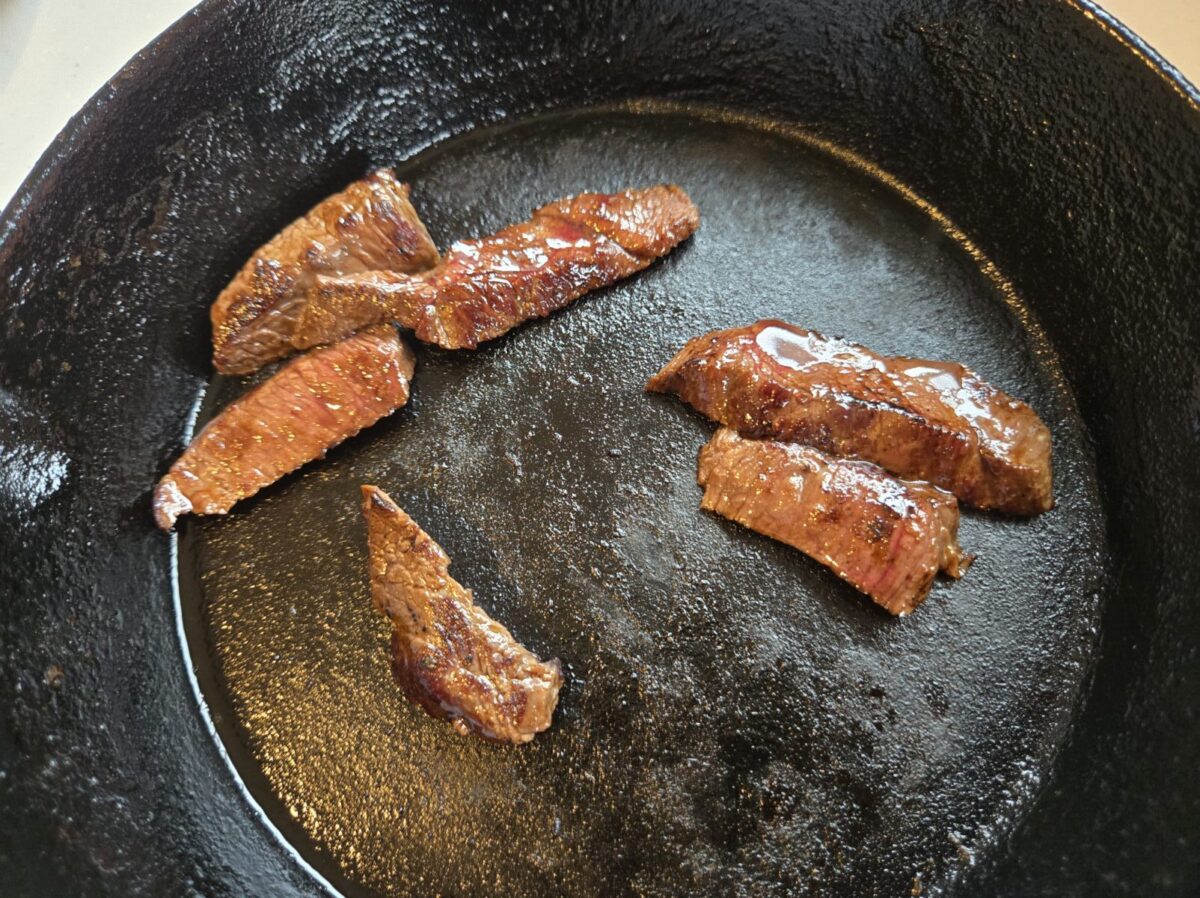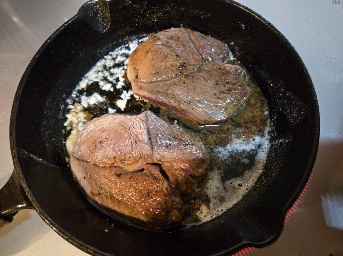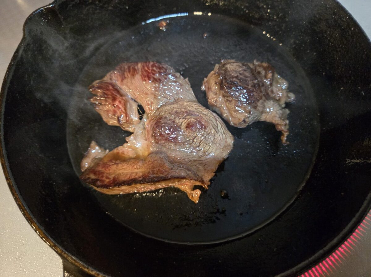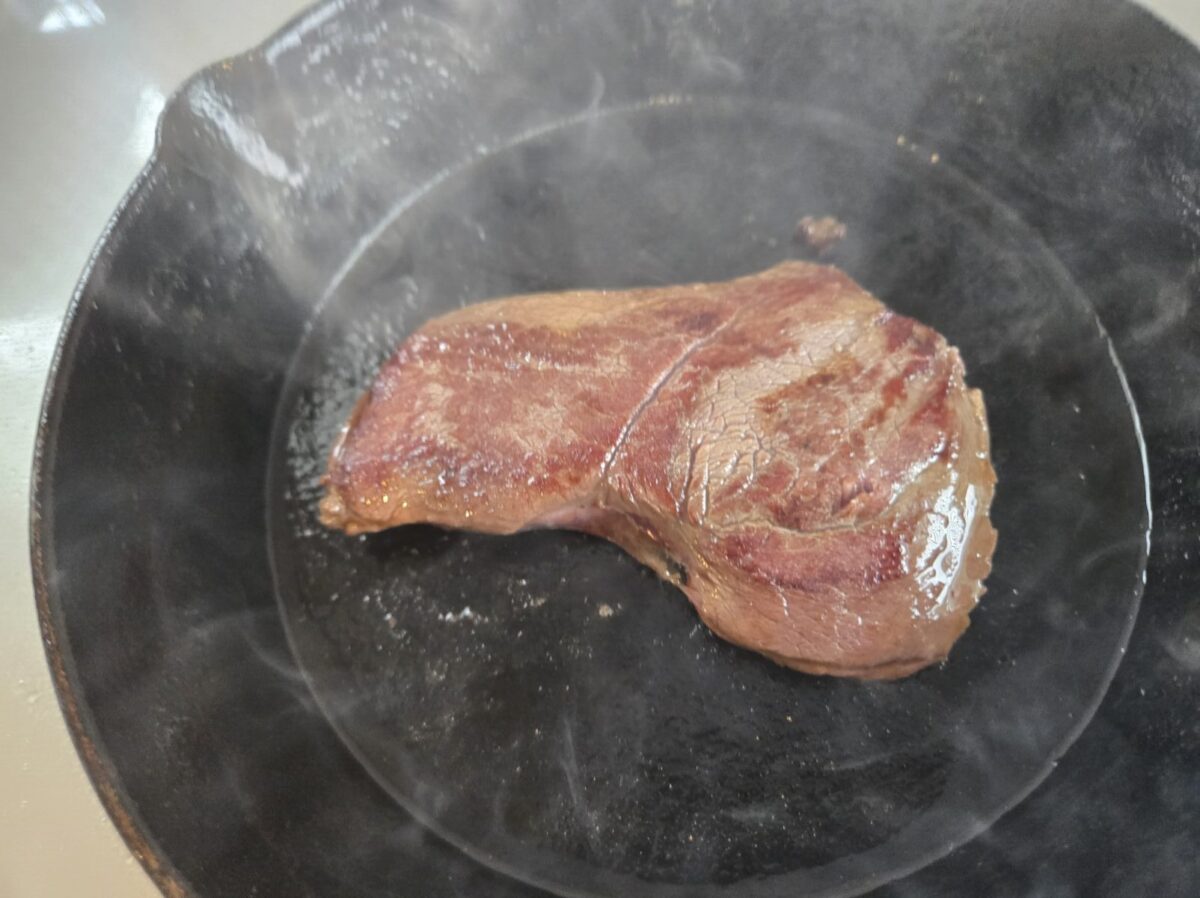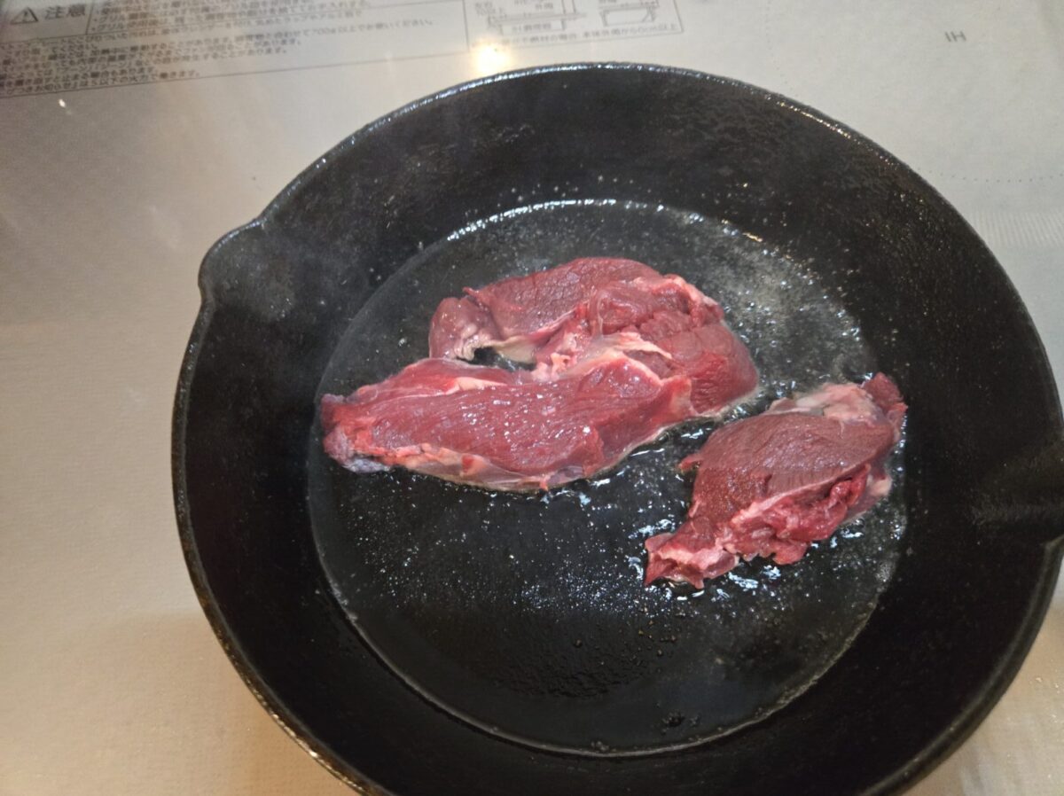 しっかりと焼いていきます。焼いたときのシカの独特の香りは少なめです。