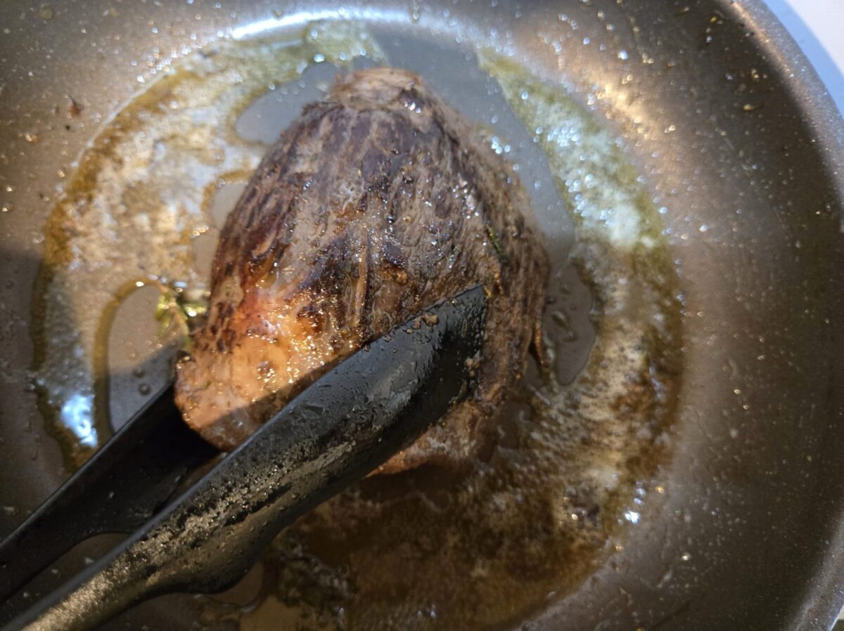 低温調理した鹿肉の表面を油使ってでさっと焼く