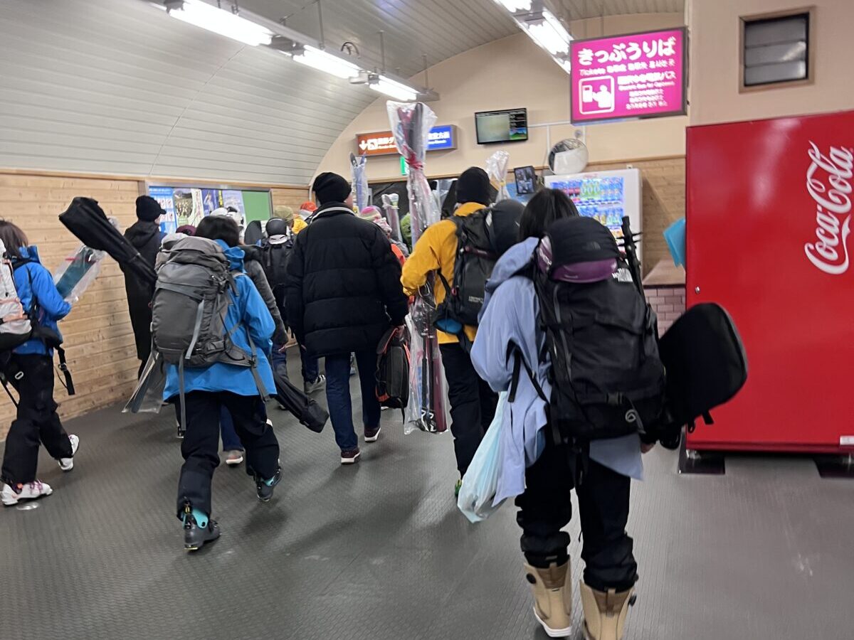 切符を購入したらこの写真の階段の上。駅の中で時間まで待機します。この間に、持っていない人はスキーやボードのカバーを購入しましょう。それがないと乗車できません。