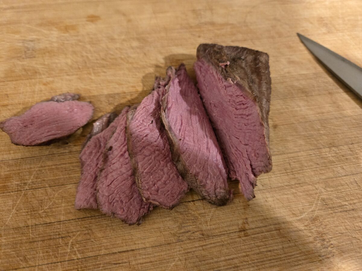 まずは、低温ローストの作り方を参照してください。次に、ローストはなるべく直角に切るのではなく、斜めに切って肉を薄く大きく切るようにしましょう。