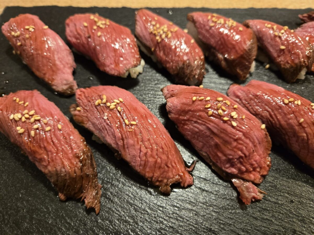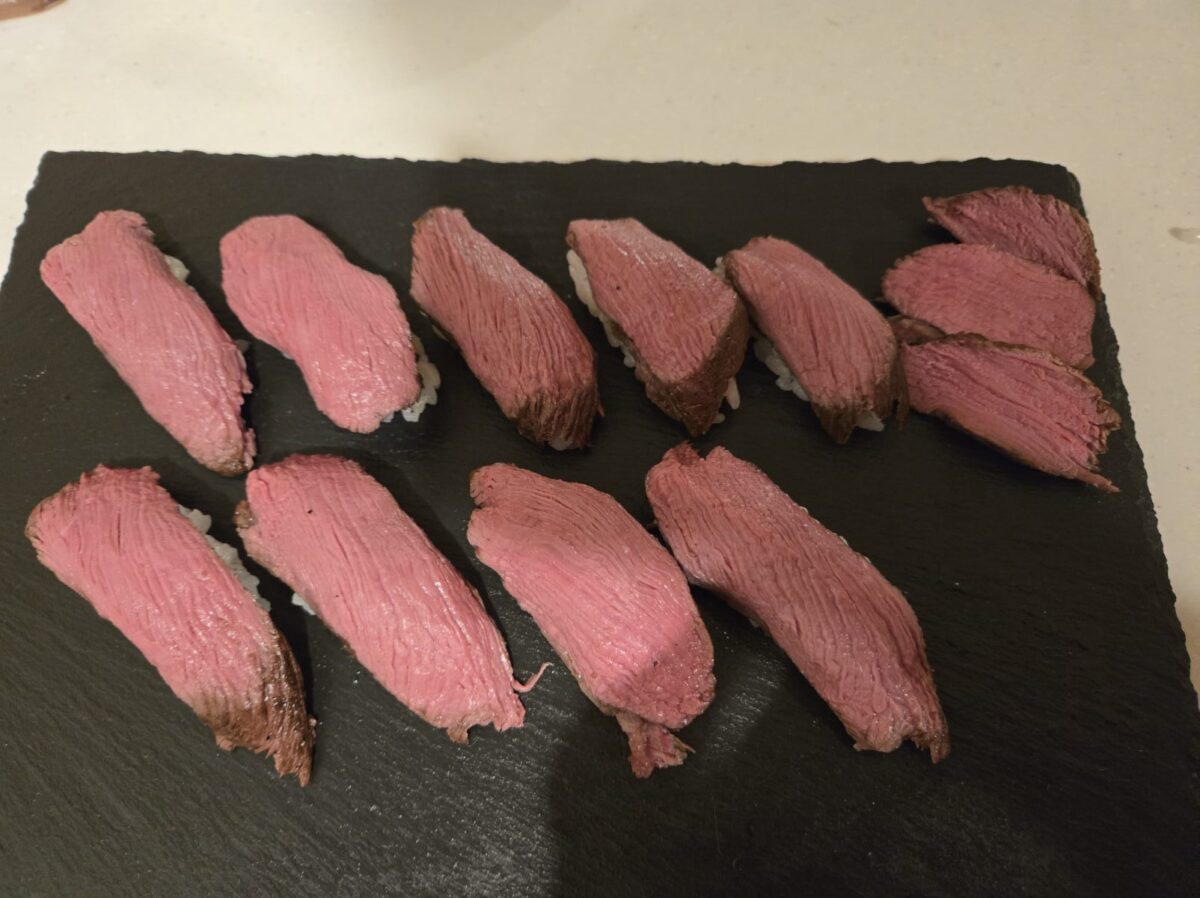 酢飯を作って、シャリの大きさに握ります。小さいおにぎりみたいな感覚です。その上に肉を乗せて少し両サイドを押さえてあげれば寿司の形になります。