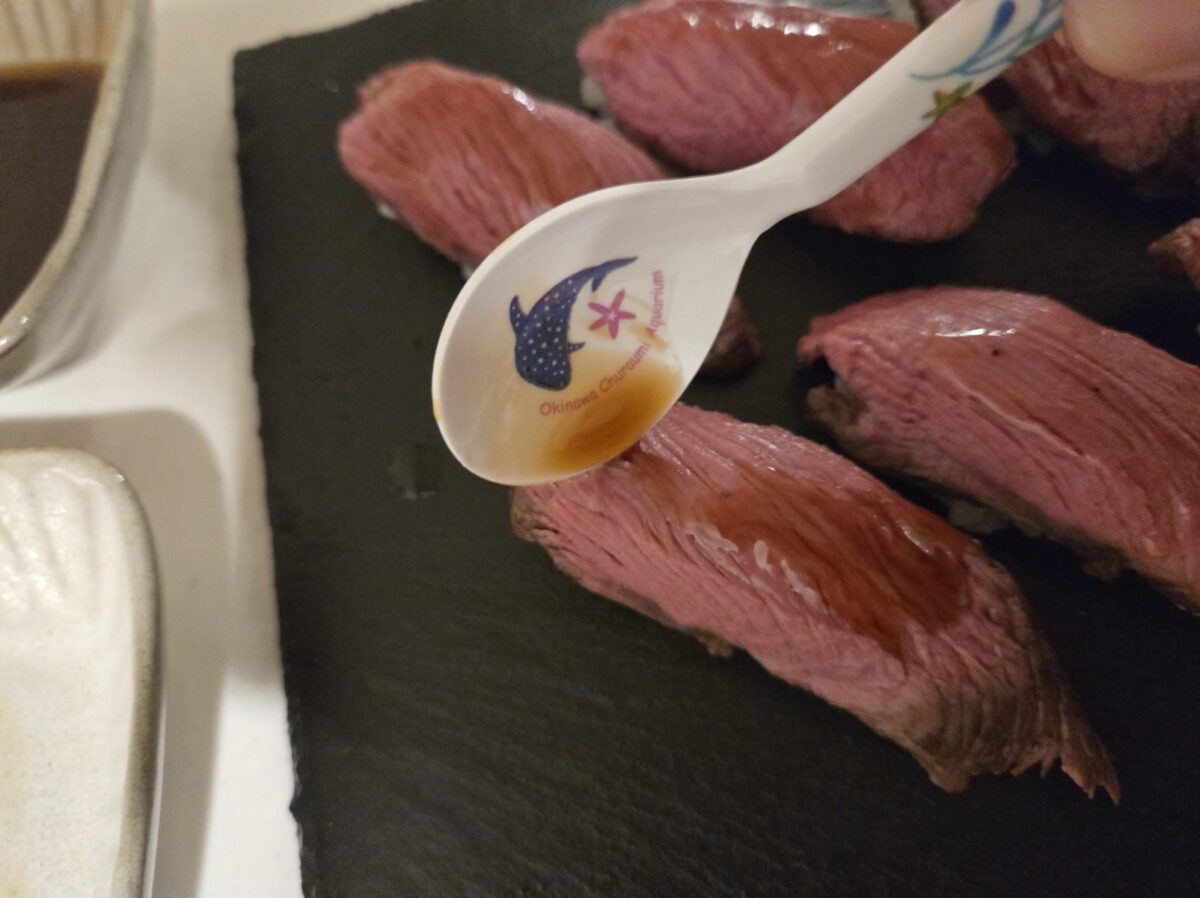 ・酢飯を寿司の形にある程度整えてから肉を乗せる